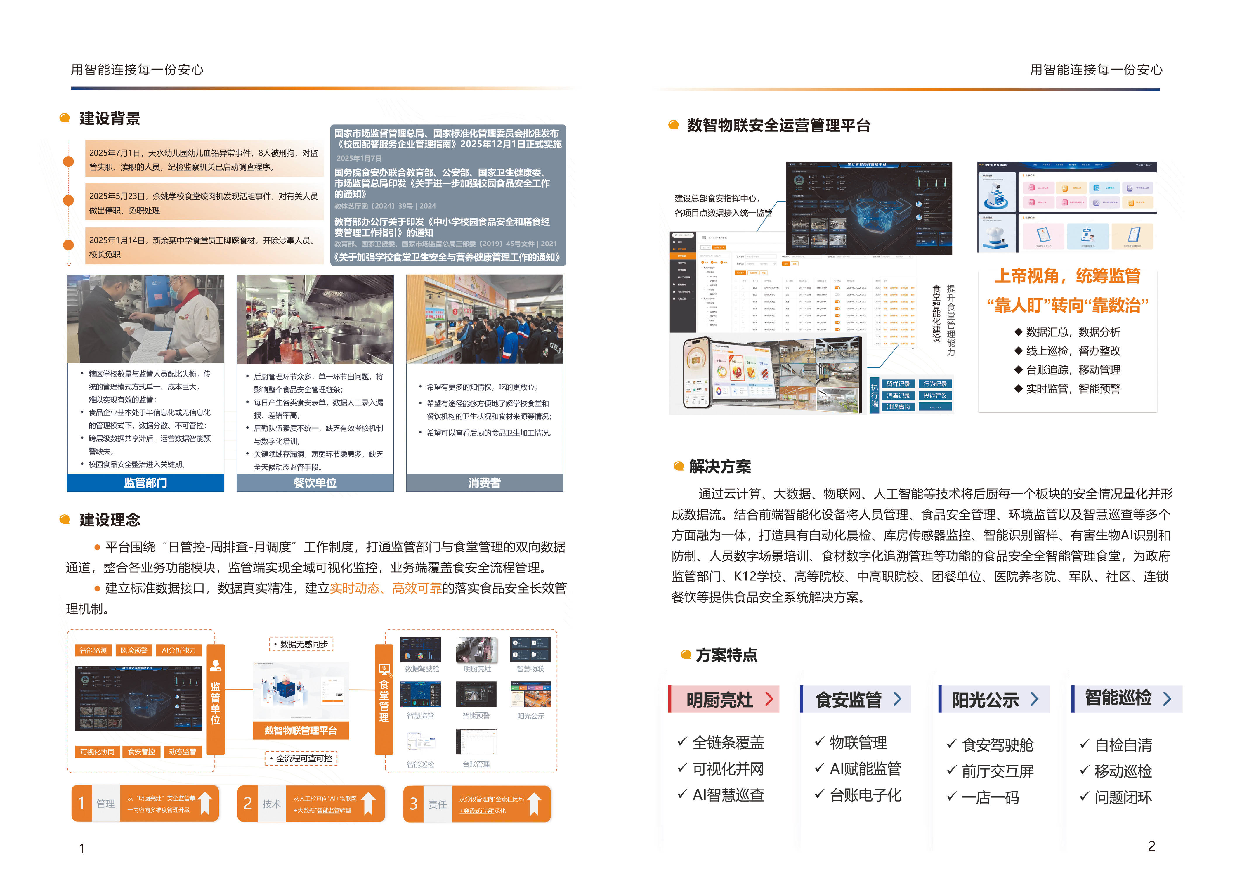 数智食安借帮先辈的数字化手艺,高效化和精准化。保守的食物平安办理模式存正在诸多短处,如辖区学校数量取监管人员配比失衡,保守办理体例单一、成本庞大,难以实现无效监管等问题。而数智食安通过大数据、物联网、人工智能等手艺,可以或许及时监测食物出产、加工、畅通等各个环节,及时发觉潜正在的平安现患,无效提高了监管效率和精准度。