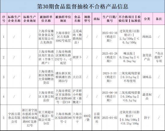 市市场监管局引见,2025年第30期省级食物平安抽检消息发布。本次抽检消息涉及8大类食物,包罗:饼干、肉成品、食糖、食用农产物、蔬菜成品、速冻食物、调味品和饮料。