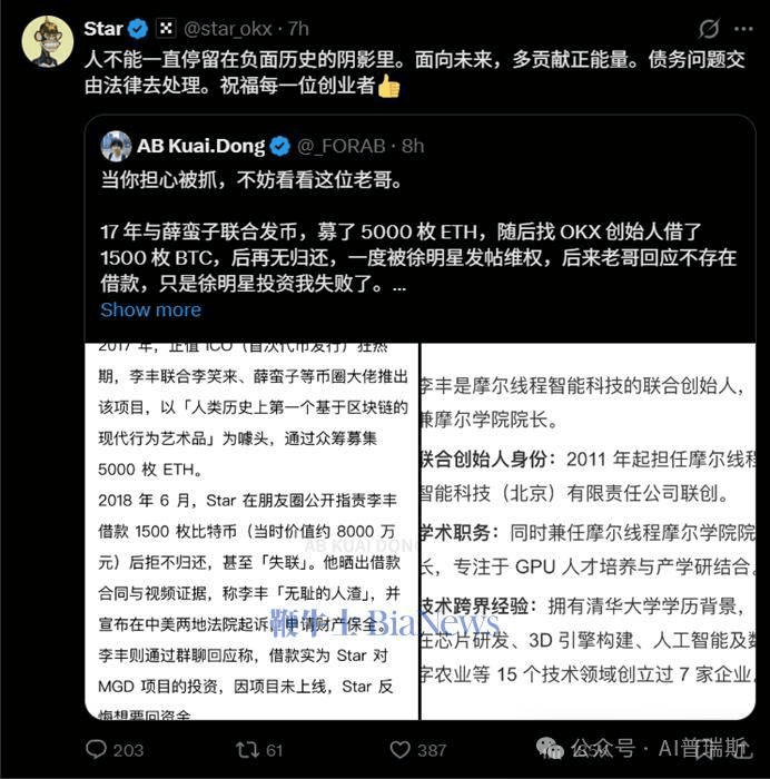 上市首日,其股价表示强势,开盘报650元/股,较刊行价114。28元上涨468。78%,总市值一度冲破3000亿元。本钱盛宴即将上演。此前的2022年-2024年,摩尔线名员工领取股份激励费用达7。68亿元,人均超百万元,笼盖64%的员工。然而,仅两日后,跟着数字货泉买卖平台OKX创始人徐明星正在社交平台上的一次互动,一则涉及疑似摩尔线程结合创始人李丰负债不还的旧案再次进入视野。