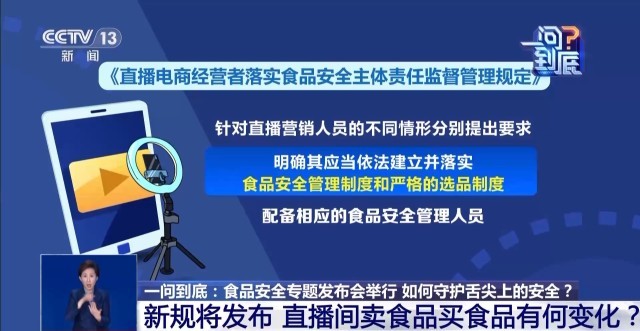 记者正在发布会上领会到,《曲播电商落实食物平安从体义务监视办理》曾经走完审核审议流程,顿时就要正式发布了。新规是若何规范从播、平台的食物平安义务的?当前正在曲播间买食物,再碰到临期、“三无”产物,是不是更便利了呢?